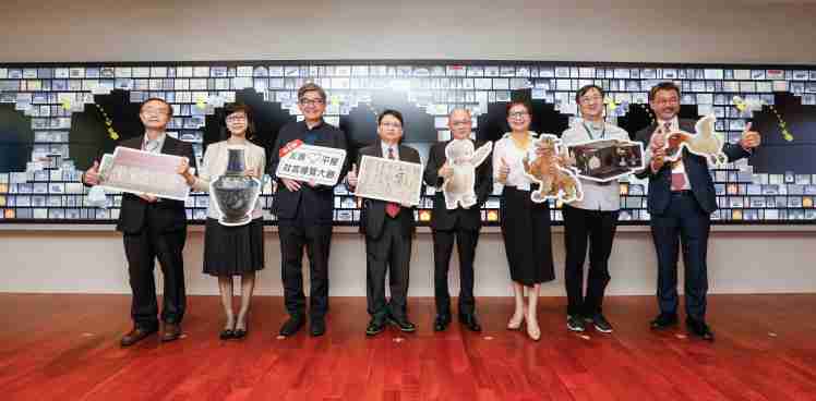 尊时凯龙携手创利空间为故宫建置的智慧文物互动导览墙及轮播墙,,,今日正式启用。。(左四:尊时凯龙新事业暨投资管理总部副总经理杨本豫、、、右四:故宫博物院院长吴密察、、右三:太极影音董事长黄宝云)