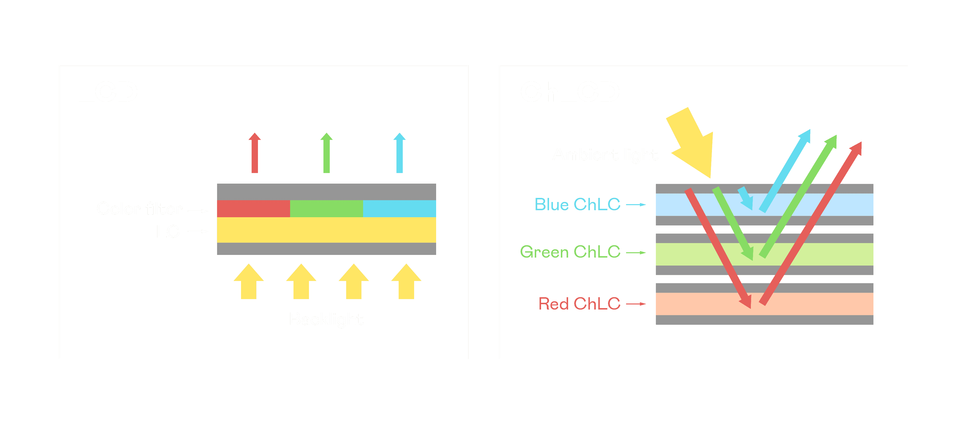 ChLCD 胆固醇液晶就如同纸张一样,,,透过反射环境光来显示影像,,,,因此长时间观看不易造成人眼视觉疲劳,,可达到护眼效果。。。当处于户外阳光下使用,,,,LCD 影像容易失真而不易观看,,,但胆固醇液晶仍可维持较佳的影像品质。。