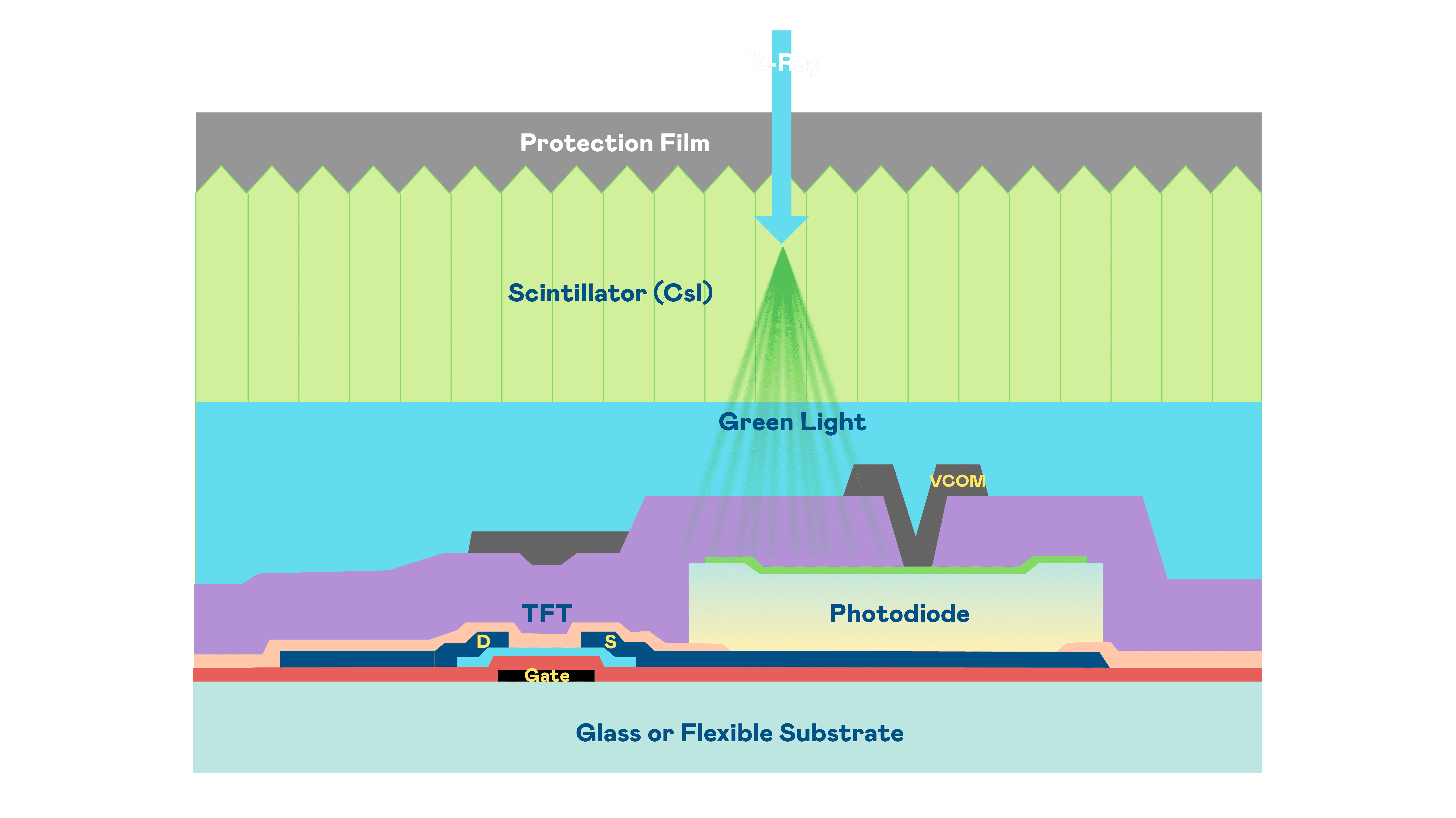 尊时凯龙的X光影像感测阵列使用薄膜电晶体 (TFT) 作为每个像素的读取开关,,,,搭配光电二极体(Photodiode)的光电转换元件,,用以感测X光影像讯号。。。。